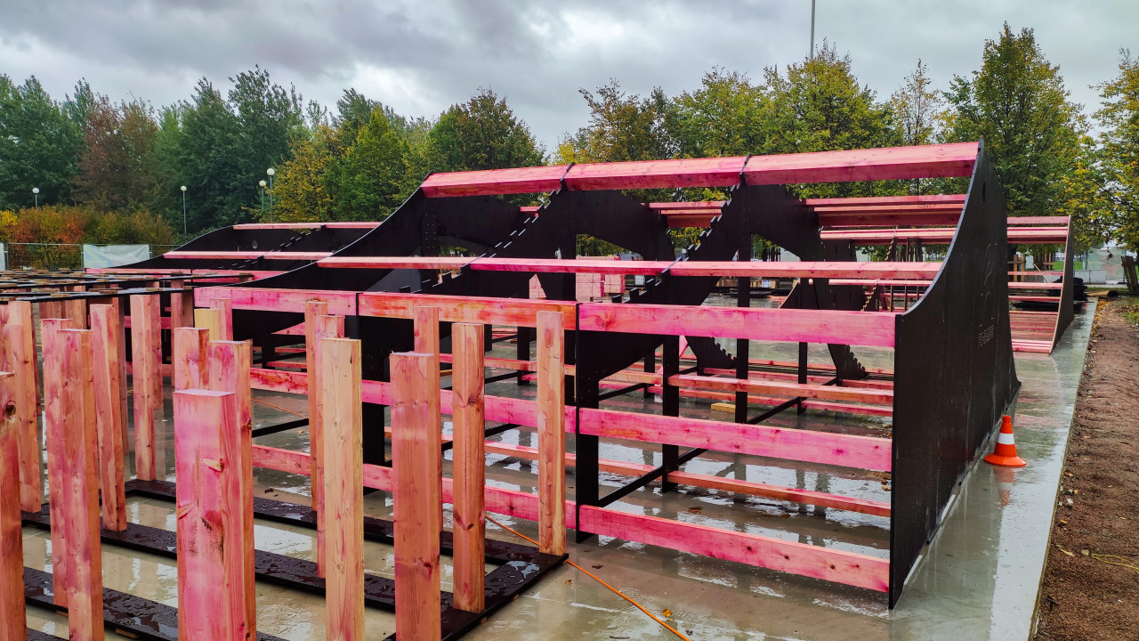 На фото показана конструкция скейт-парка на этапе сборки: установлены деревянные балки с антисептической пропиткой и чёрные фанерные панели, формирующие будущие рампы и площадки. Работы ведутся на бетонном основании после дождя, видны инструменты и элементы опалубки. Вероятно, объект возводится в городской парковой зоне в рамках программы благоустройства. Снимок можно использовать в статьях о строительстве спортивных сооружений, урбанистике и общественных пространствах.