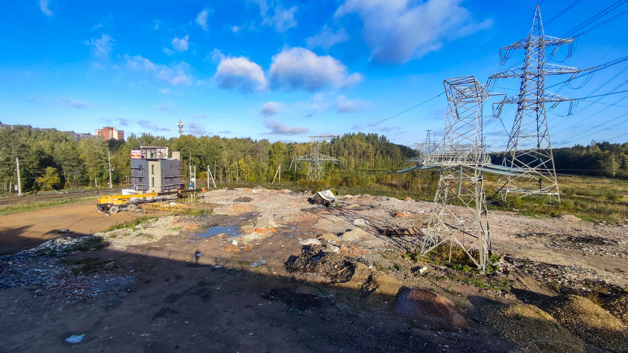 Фотография показывает строительную площадку на окраине города, где ведутся работы по подготовке территории рядом с линиями электропередачи. На снимке видны металлические опоры ЛЭП, уходящие вдаль, грунтовая площадка с насыпями и следами техники, остатки строительных материалов и временные сооружения. Слева расположен небольшой дом, окружённый строительными лесами и краном. За площадкой — лесной массив и виднеющиеся городские постройки. Фото подходит для иллюстрации тем энергетики, инженерных коммуникаций и промышленного освоения территорий.