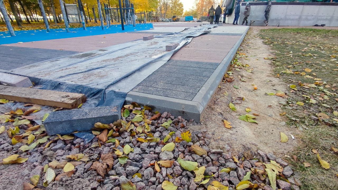Фотография демонстрирует процесс благоустройства пешеходной зоны в парке, где на переднем плане виден участок с уложенной плиткой и края с бордюрным камнем. Поверх плиточного покрытия частично расположена защитная пленка, предотвращающая попадание мусора и осенних листьев перед окончательной обработкой. По краю заметен слой щебня, используемый в качестве основания, вдоль газона виден траншееподобный углубленный участок. В глубине кадра находятся рабочие, занятые строительно-монтажными операциями. Эта фотография может быть использована в материалах о технологиях укладки покрытий, стандартах благоустройства, городских тротуарах и реконструкциях общественных пространств.