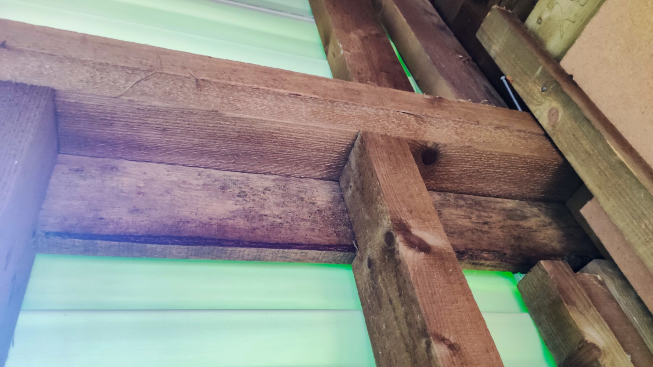 На фото крупным планом запечатлён узел соединения деревянных балок в стене каркасного строения. Видно плотное прилегание элементов и следы обработки древесины. Фон составляют панели внешней обшивки из профлиста зелёного цвета. Такое соединение используется при монтаже горизонтальных и вертикальных несущих элементов. Фото подходит для технических публикаций и обучающих материалов по каркасному домостроению.