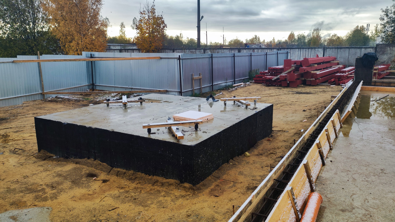 На фотографии запечатлён отдельный фундаментный блок на строительной площадке будущей котельной, расположенный рядом с основной плитой. Блок покрыт гидроизоляционным слоем, на его верхней части расположены металлические закладные детали, предназначенные для дальнейшего крепления технологического оборудования. На заднем плане видны металлическое ограждение стройплощадки и склад металлоконструкций, подготовленных к монтажу. Элемент относится к периоду нулевого цикла, когда формируются опорные основания под узлы, размещаемые отдельно от основной части здания. Изображение может использоваться в публикациях о фундаментных работах, инженерной подготовке и технологиях строительства энергообъектов.