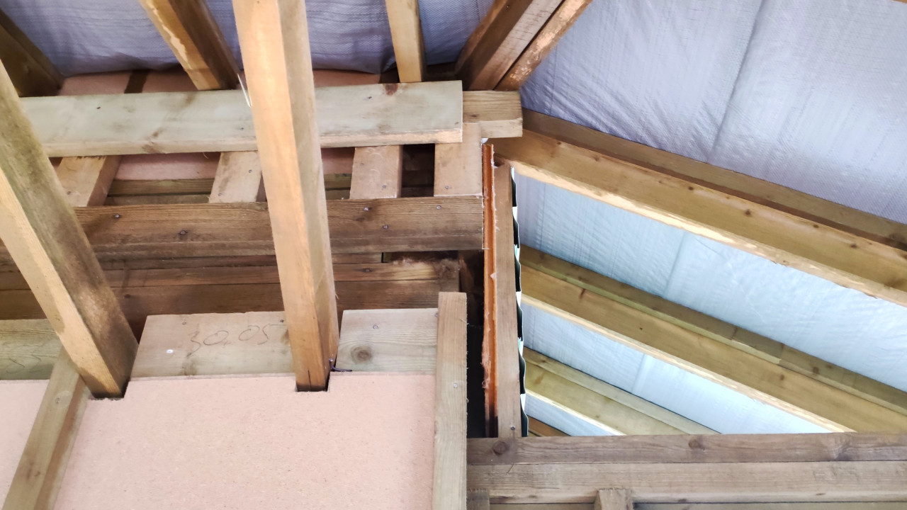 На фотографии изображён верхний угол строящегося каркасного дома, где пересекаются стропильные и потолочные балки. Видна деревянная обрешётка, пароизоляционный слой под кровлей и элементы обшивки. Этот участок конструкции обеспечивает прочность и устойчивость крыши. Снимок можно использовать в статьях о строительстве, проектировании и монтаже кровельных систем.