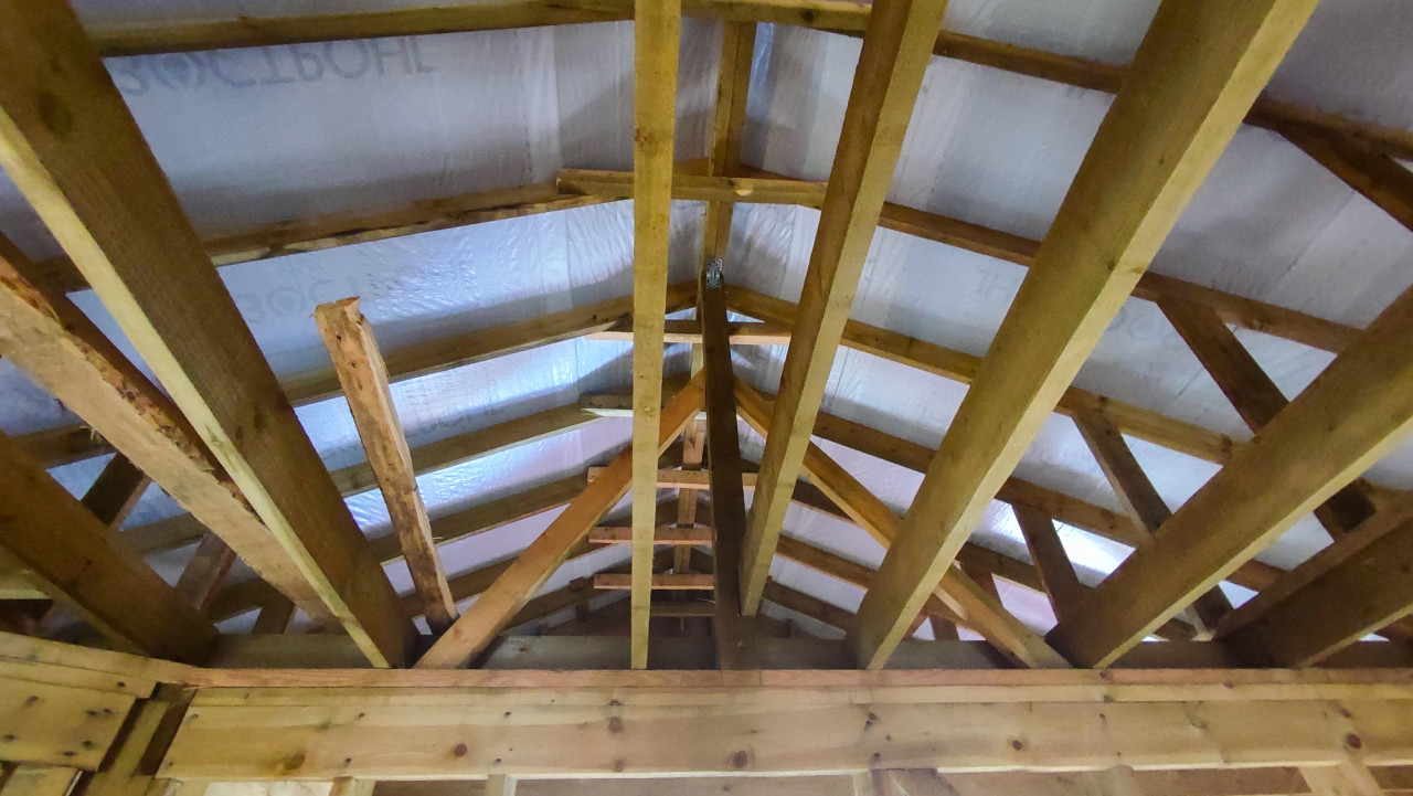 На изображении показана внутренняя часть кровельной системы строящегося дома. Деревянные стропила и балки образуют устойчивый каркас, закреплённый металлическими элементами. Под кровлей установлена светоотражающая пароизоляционная мембрана. Фото демонстрирует этап монтажа конструкции перед установкой утеплителя и внешнего покрытия, что делает его полезным для обучающих материалов по строительству и инженерному делу.