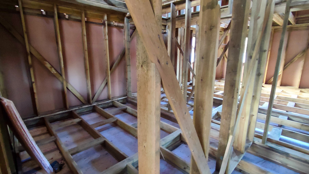 На фотографии показан вид изнутри строящегося каркасного дома. Деревянные стойки и балки образуют несущие стены и перегородки. На полу уложены лаги, подготовленные под настил. Каркас выполнен из обработанных пиломатериалов, соединённых гвоздями и металлическими элементами. Фото иллюстрирует ранний этап строительства перед утеплением и обшивкой и может использоваться в статьях о технологиях каркасного домостроения.
