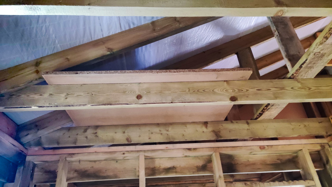 На снимке видна часть конструкции мансарды каркасного дома, где уложены деревянные балки и панели чернового перекрытия. Сверху заметен слой теплоизоляции под кровлей, отражающий светоизоляционную плёнку. Конструкция демонстрирует этап устройства стропильной системы и настила, применяемого при монтаже мансардного перекрытия. Использованы стандартные пиломатериалы, обработанные для защиты от влаги и биоповреждений. Фотография подходит для использования в материалах о технологиях строительства, утеплении кровли, а также в инструкциях по монтажу деревянных конструкций.