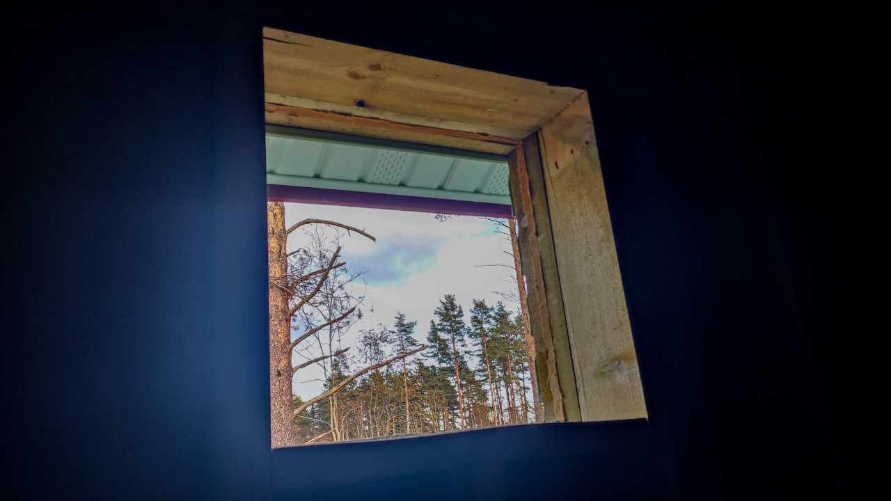 На фотографии изображён оконный проём в стене строящегося каркасного дома. Через проём виден фрагмент кровельного свеса и пейзаж с соснами на фоне облачного неба. Внутренняя часть конструкции выполнена из деревянных досок и бруса без отделки, что свидетельствует о стадии чернового строительства. Снимок отражает этап подготовки проёмов под установку оконных рам. Изображение может использоваться для иллюстрации технологии монтажа оконных проёмов, а также в статьях о строительстве деревянных домов и обустройстве интерьера.