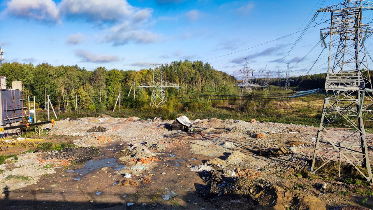 На фото показаны металлические опоры высоковольтных линий электропередачи, пересекающие пологий участок земли. На переднем плане виден строительный мусор, остатки кирпича и грунт. Слева расположено недостроенное здание с рабочими и техникой. На горизонте тянется зелёный лес и открытое поле. Сцена отражает инженерную инфраструктуру и процесс освоения промзоны. Изображение может использоваться в публикациях о строительстве, энергетике и развитии территорий.