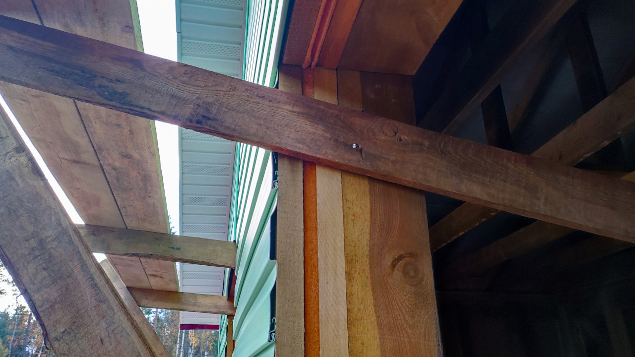На фото изображён фрагмент стропильной системы и свес кровли строящегося каркасного дома. В кадре видны деревянные балки, элементы крепления и часть фасада, обшитого панелями светло-зелёного цвета. Снаружи различимы детали подшивки свеса и кровельного покрытия. Снимок отражает процесс устройства кровельного узла и может быть использован в статьях о монтаже деревянных крыш, архитектуре малоэтажного домостроения и технологиях строительства каркасных домов.