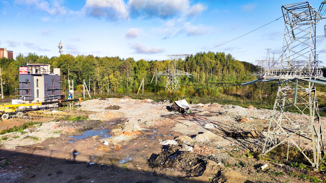 Фотография демонстрирует участок застройки, расположенный вблизи лесного массива и высоковольтных линий электропередачи. На площадке виден небольшой строящийся дом с рекламным щитом об аренде участка, рабочие в касках и техника. На переднем плане располагаются насыпи из песка, щебня и строительного мусора, а также временное укрытие из брезента. В правой части кадра тянутся мощные металлические опоры ЛЭП, уходящие вдаль. Снимок может быть использован для иллюстрации тем, связанных с энергетикой, инфраструктурой и строительными проектами в пригородной зоне.