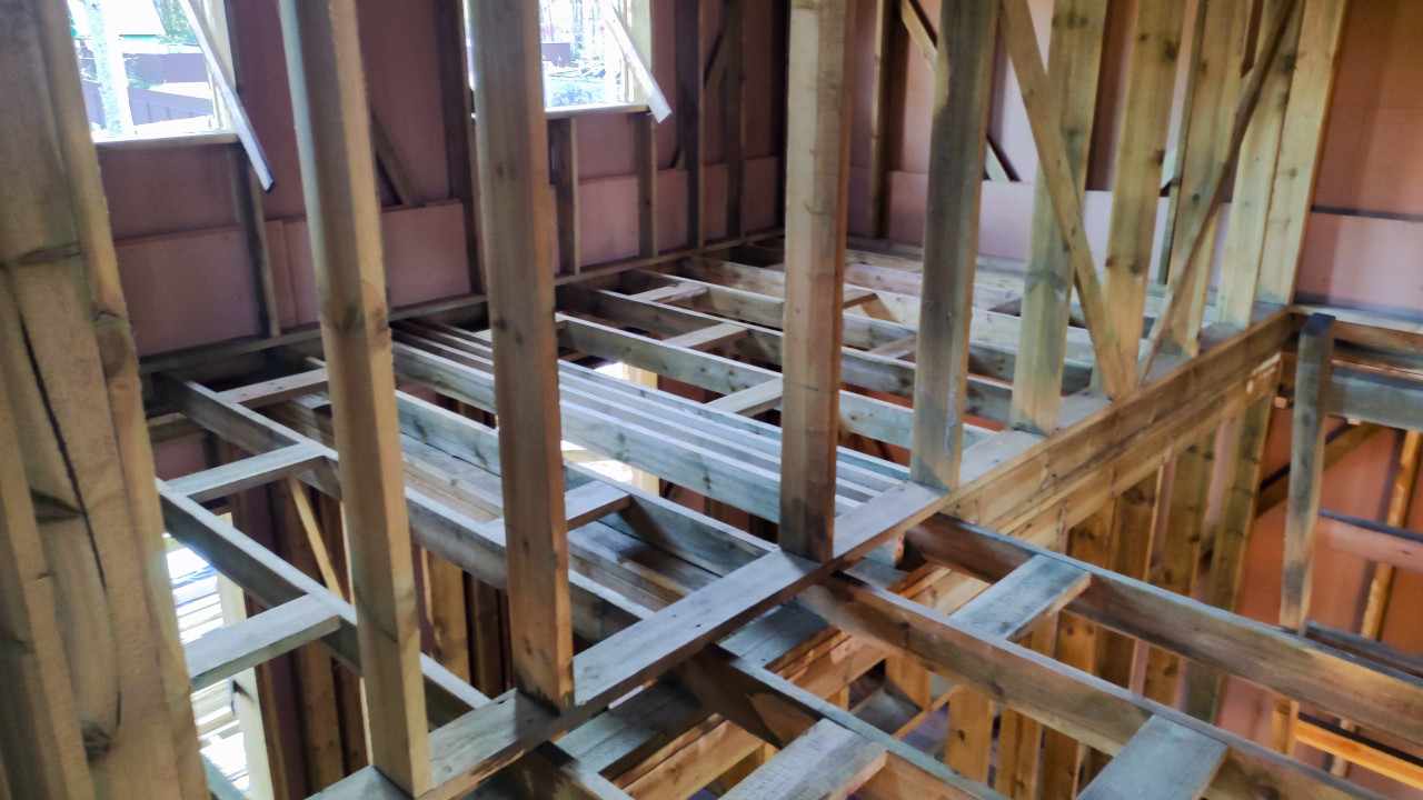 На фотографии изображён фрагмент строящегося дома с деревянными перекрытиями между этажами. Видны балки, уложенные на несущие стойки, и оконные проёмы, через которые проходит дневной свет. Конструкция выполнена из пиломатериала и представляет собой этап до настила пола и утепления. Фото может быть использовано в статьях и учебных материалах по строительству и проектированию каркасных зданий.