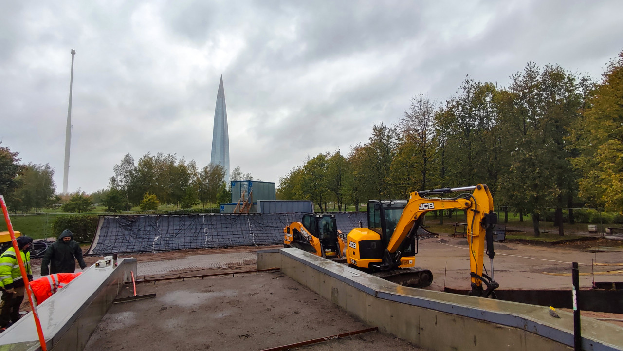 Строительство бетонного скейт-парка у башни Лахта Центр в Санкт-Петербурге
