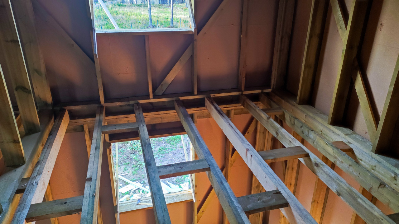 На фото показана внутренняя часть строящегося дома, где видны балки межэтажного перекрытия и наклонная кровля. Через большие оконные проёмы поступает дневной свет, что подчёркивает объём помещения. Конструкция выполнена из деревянных элементов, закреплённых гвоздями. Фото демонстрирует этап строительства перед монтажом утеплителя и обшивки, подходящее для технических публикаций и строительных каталогов.
