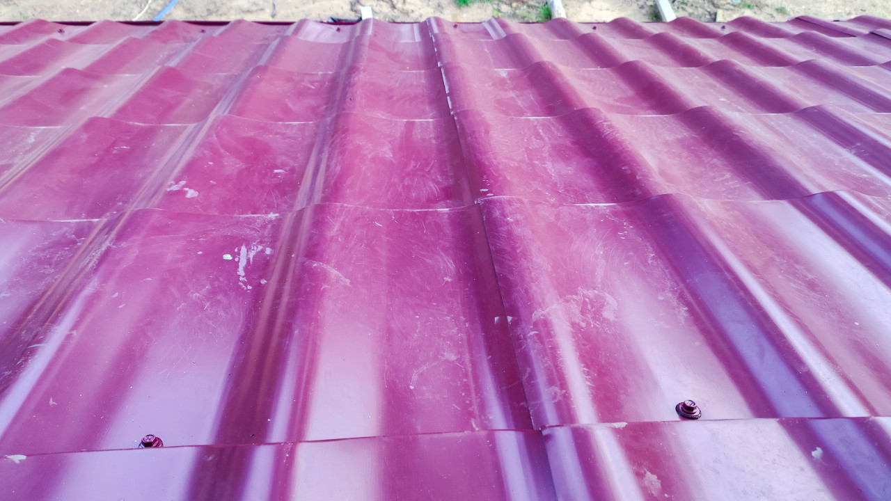 На изображении показана поверхность крыши, покрытая бордовой металлочерепицей. Листы закреплены рядами саморезов с уплотнителями, обеспечивающими герметичность стыков. На поверхности видны следы пыли и монтажных работ, что говорит о недавнем завершении установки. Фото отражает типовую технологию устройства кровельного покрытия в частном домостроении и подходит для иллюстрации строительных инструкций, презентаций производителей металлочерепицы или обучающих материалов по монтажу.