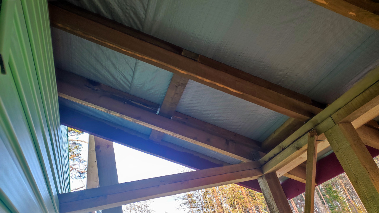На фотографии запечатлён элемент соединения кровли с фасадом дома, обшитого сайдингом зелёного цвета. Конструкция выполнена из деревянных балок с использованием пароизоляционного слоя под кровлей. Снимок сделан снаружи, под углом, что позволяет рассмотреть структуру стропильной системы и утеплённый контур здания. На заднем плане виден фрагмент участка с деревьями. Изображение отражает современную технологию устройства кровельных узлов в малоэтажном домостроении и может применяться для иллюстрации монтажных решений, строительных инструкций и проектных схем.