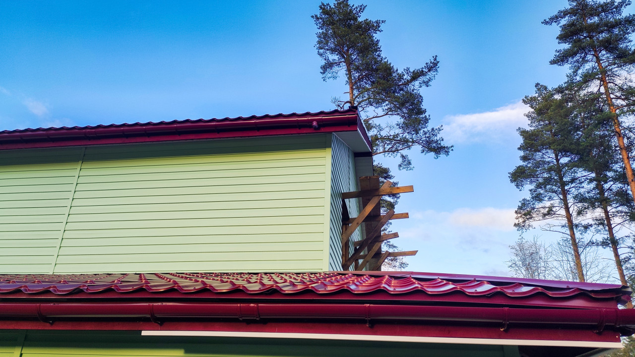 На фотографии изображён фрагмент фасада загородного дома, отделанного зелёным виниловым сайдингом. Кровля выполнена из красной металлочерепицы, а на стыке виден водосточный желоб. На заднем плане — высокие сосны и голубое небо. Снимок отражает архитектурные особенности современных загородных домов с применением долговечных и эстетичных материалов. Фото можно использовать в статьях о строительстве, облицовке, кровельных системах и дизайне фасадов.