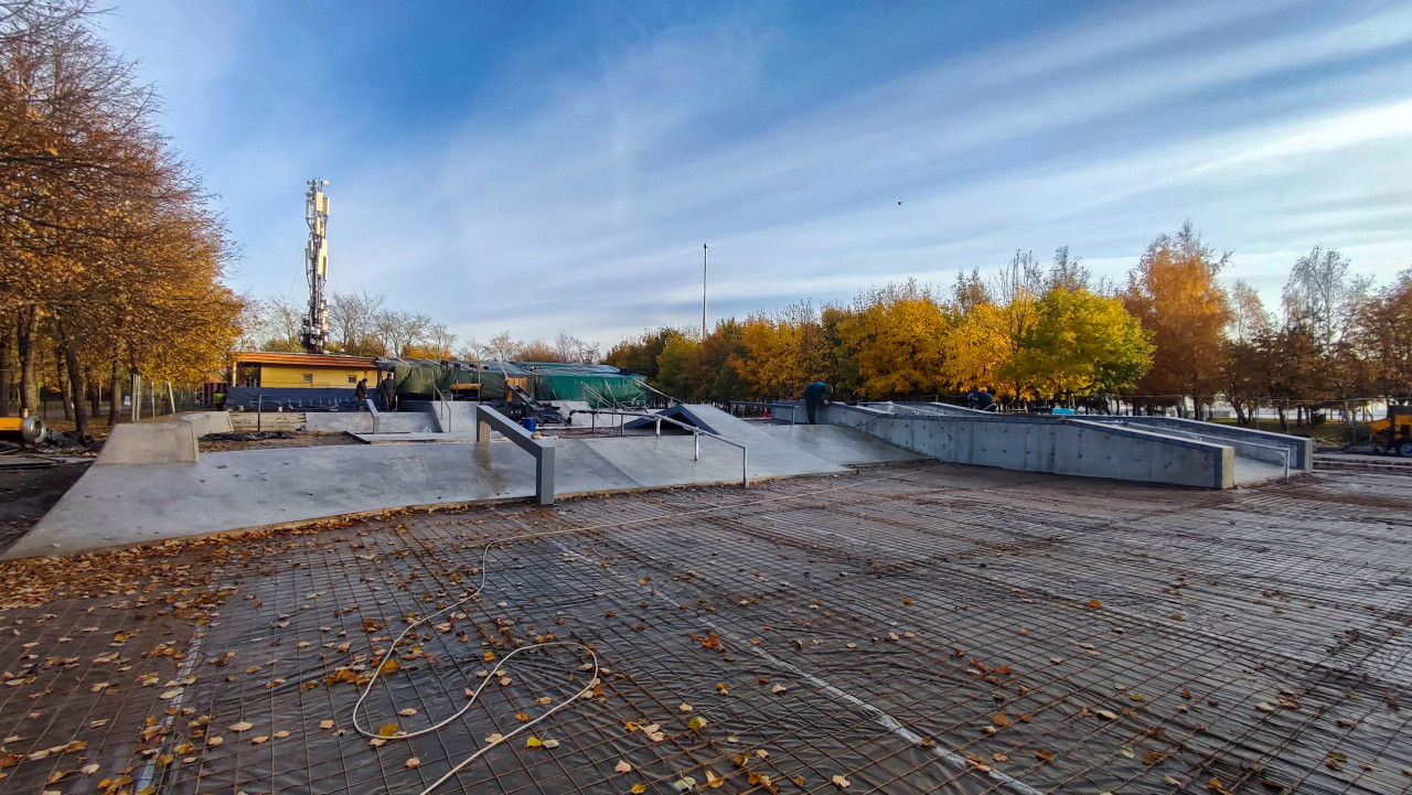 На изображении зафиксирован монтаж элементов будущего скейт-парка, включающих наклонные бетонные фигуры, парапеты и перила. Работы ведутся на открытой территории в окружении деревьев с осенней листвой. В тыловой зоне размещены строительные конструкции, временные укрытия и обслуживающая техника. На переднем плане заметно усиление основания, выполненное арматурной сеткой, что говорит о подрядочных работах до завершающей стадии. Кадр может использоваться в материалах о проектировании и строительстве спортивных объектов, подготовке покрытий и внедрении инфраструктуры для городских видов спорта.