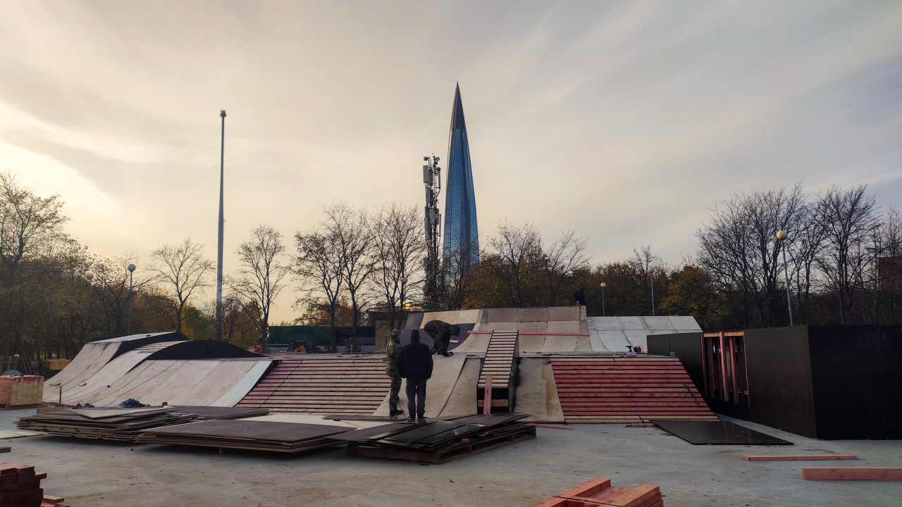 Этап сборки элементов скейт-парка с видом на Лахта-центр
