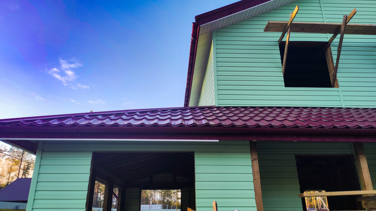 На фотографии показан фрагмент строящегося двухэтажного дома, отделанного зелёным виниловым сайдингом. Кровля выполнена из тёмно-красной металлочерепицы, установлены деревянные элементы временных строительных конструкций. В кадре видны окна без рам и проём на втором этаже, что указывает на незавершённый этап монтажа. Ясное небо и мягкое освещение подчеркивают детали отделки. Снимок можно использовать в материалах о строительстве, облицовке фасадов, монтаже кровельных систем и архитектуре частных домов.