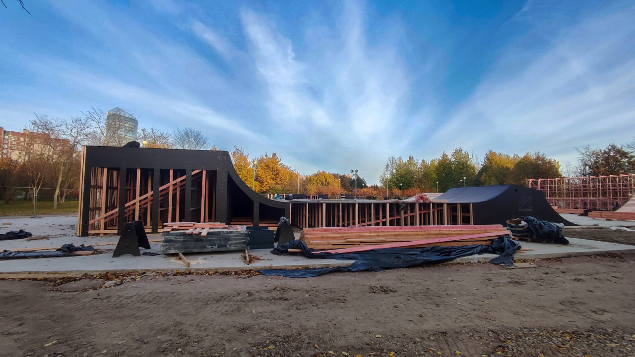 На изображении отображён процесс монтажа деревянных каркасов рамп на открытой территории скейт-парка. Видны конструкции из деревянных балок, формирующие основу будущих фигур, а также строительные материалы, размещённые на площадке. На фоне просматриваются деревья, ограждения и временные постройки подрядчика. Кадр фиксирует переход от бетонного этапа строительства к монтажу надстроек и может применяться для статей о спортивном строительстве, инженерных технологиях и подготовке инфраструктуры для экстремальных видов спорта.