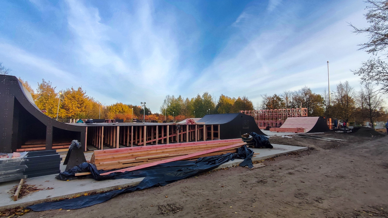 На фотографии показан каркасный элемент будущей рампы скейт-парка, выполненный из деревянных конструкций и установленных на бетонное основание. На заднем плане присутствует ещё одна собираемая фигура и монтажная рама, что отражает параллельное строительство нескольких объектов. Видны материалы, подготовленные для дальнейшей обшивки и усиления конструкции. Осенняя парковая зона обозначает, что объект возводится в открытом городском пространстве. Снимок подходит для публикаций о технологиях в уличных видах спорта и этапах инженерной подготовки спортивных объектов.