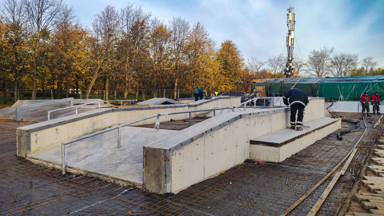 На фотографии показаны рабочие, занятые установкой и доводкой бетонных элементов будущего скейт-парка на открытой строительной площадке. В кадре видны массивные геометрические фигуры, предназначенные для катания, а также ограждения и направляющие конструкции. На заднем плане размещены временные укрытия и техническое оборудование, что указывает на активную фазу строительства. Осенняя парково-лесная зона вокруг объекта подчёркивает открытый характер площадки. Снимок подходит для статей о рабочих процессах, строительстве общественных спортивных пространств и этапах монтажа городской инфраструктуры.