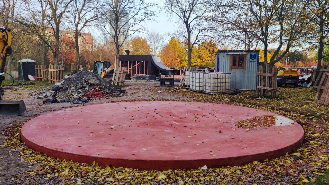 На фото запечатлена круглая бетонная площадка, расположенная на территории строительства скейт-парка. Вокруг видны строительные материалы, контейнеры, временные ограждения и техника. На заднем плане можно увидеть небольшой деревянный скейт-элемент на стадии возведения, а также кучу строительного мусора, характерную для подготовительной стадии благоустройства. Осенняя листва подчёркивает сезон проведения работ. Снимок подходит для иллюстрации этапов формирования инфраструктуры и благоустройства общественных пространств.