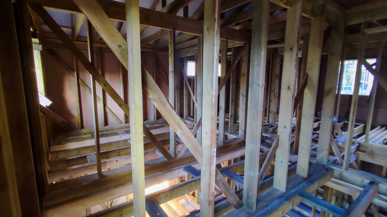 На фото показан фрагмент второго этажа строящегося каркасного здания, где смонтированы стойки, балки и укосины, формирующие несущий каркас. Видны два оконных проёма, обеспечивающие естественное освещение помещения. Конструкция выполнена из обработанной хвойной древесины, что типично для малоэтажных зданий в северных регионах. Пространство ещё не закрыто настилом и утеплителем, что подчёркивает промежуточную стадию строительства. Такой снимок информативен для иллюстрации учебных материалов, проектной документации, строительных блогов и публикаций о современных технологиях каркасного домостроения.
