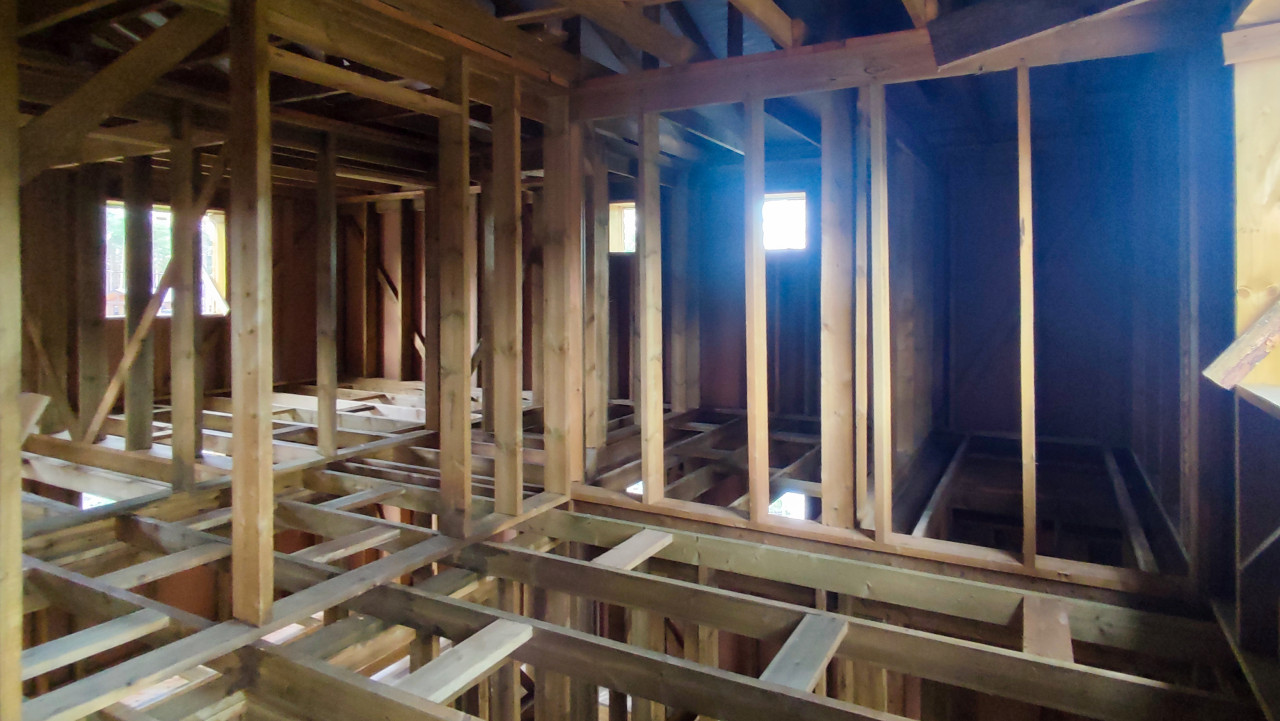 На снимке показан фрагмент внутреннего пространства строящегося деревянного дома. Видны вертикальные стойки, балки перекрытий и оконные проёмы, образующие основу будущих комнат. Конструкция выполнена из пиломатериала и находится на этапе сборки без внутренней отделки. Снимок демонстрирует технологию монтажа внутренних перегородок и перекрытий в частном домостроении. Подходит для иллюстраций строительных проектов, учебных материалов и документации по монтажу.