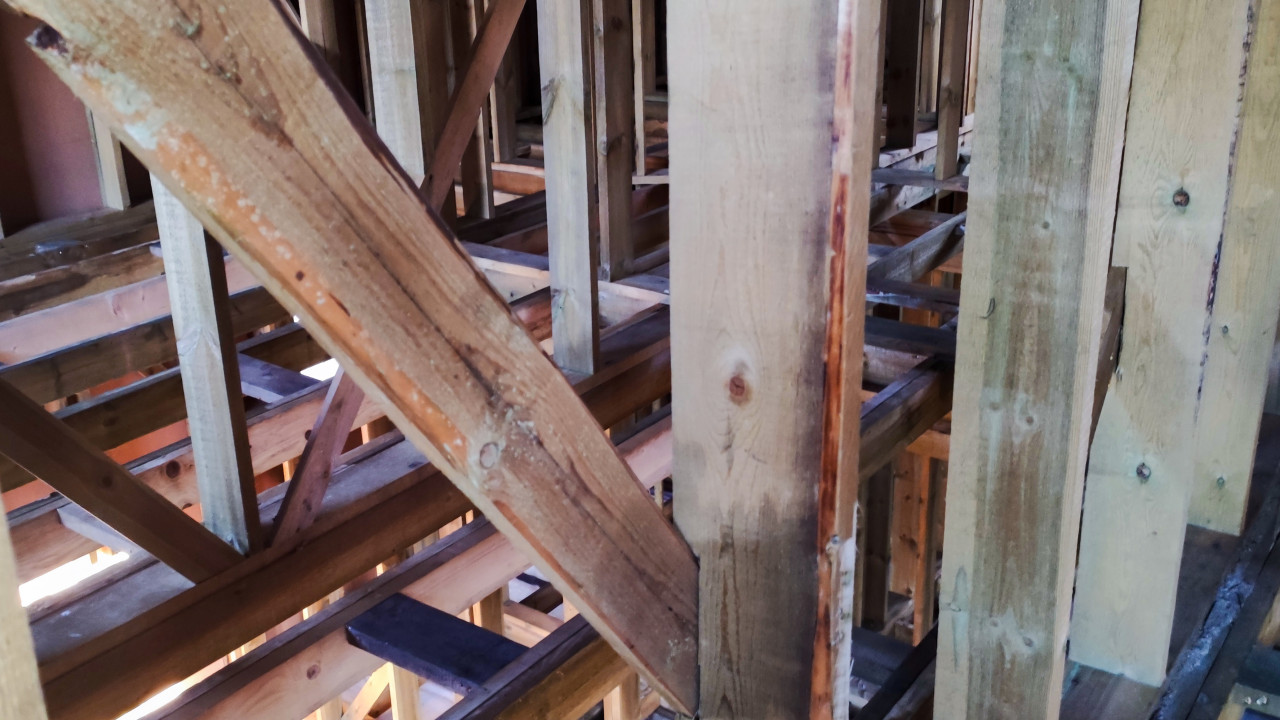 На фотографии показан фрагмент узлового соединения стоек и укосин деревянного каркаса здания. Хорошо видна текстура древесины и качество распила досок, а также следы антисептической обработки. Снимок отражает конструктивные особенности соединений, обеспечивающих устойчивость и жёсткость стен. Фото демонстрирует важный элемент строительной технологии — правильное сопряжение несущих деталей при возведении каркасного дома. Изображение подходит для технических публикаций, учебных пособий, инструкций по сборке и контроля качества деревянных конструкций.
