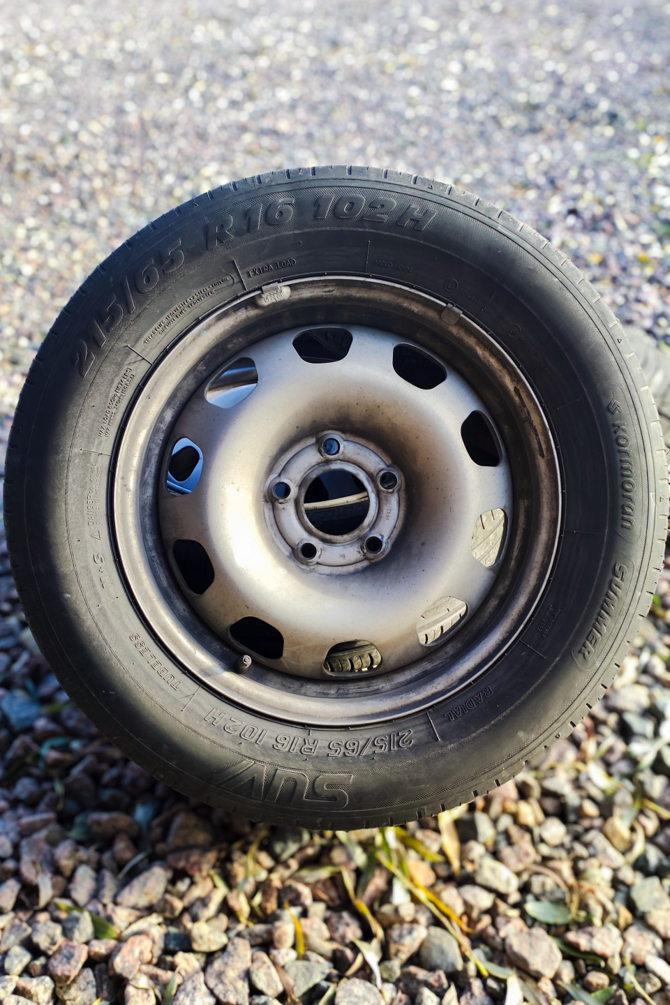 Изображено автомобильное колесо с шиной размером 215/65 R16, установленной на металлическом штампованном диске. Колесо снято крупным планом на фоне гравийного покрытия. На боковой поверхности шины читаются маркировки, обозначающие типоразмер, индекс нагрузки и скорости. Состояние поверхности указывает на эксплуатацию в течение длительного времени. Снимок может использоваться в материалах о ремонте автомобилей, шиномонтаже, техническом обслуживании транспортных средств и выборе автомобильных шин.