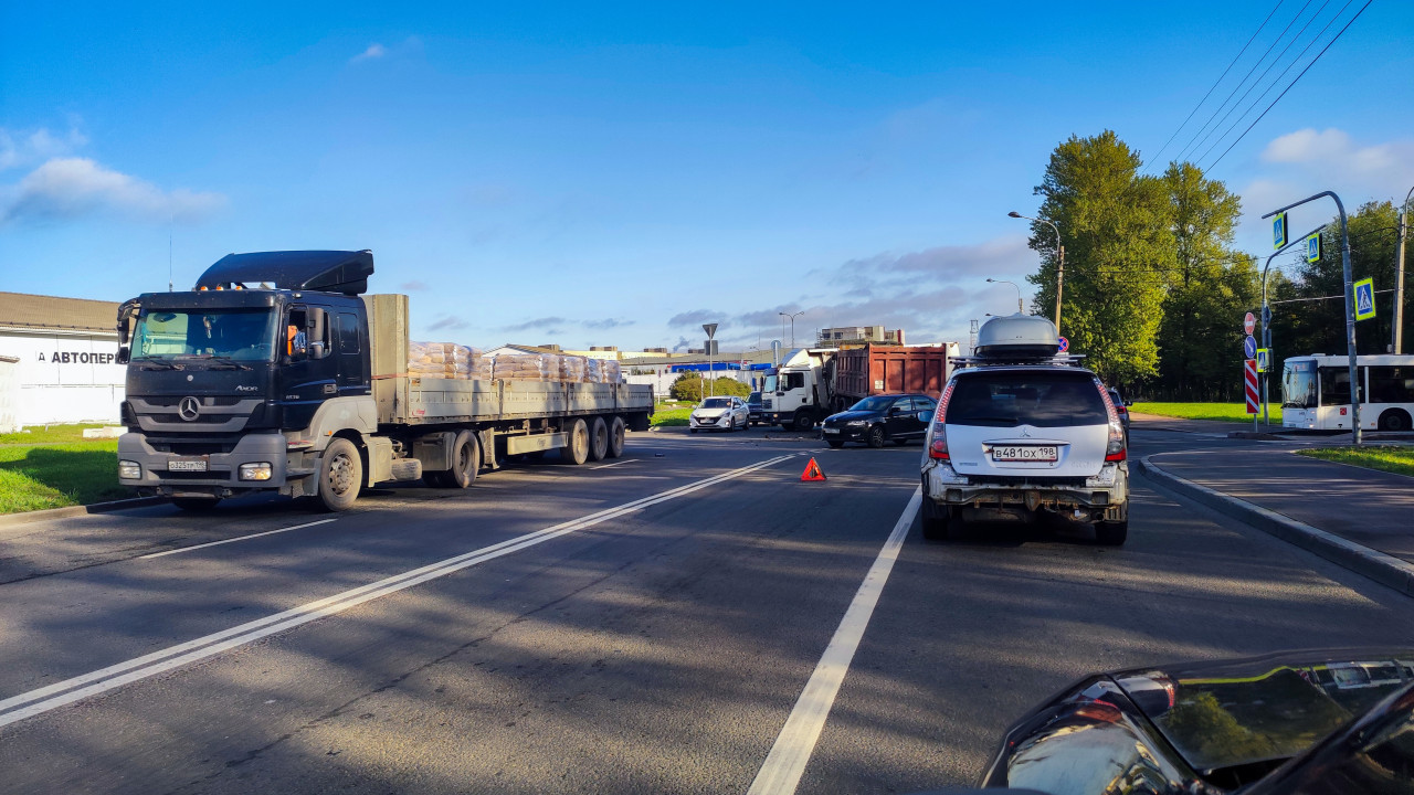 На снимке изображён участок оживлённой городской дороги, где произошло ДТП с участием легковых автомобилей и грузовика. В центре кадра виден аварийный треугольник, на обочине стоят повреждённые машины, включая грузовик с прицепом и несколько легковушек. На заднем плане — остановившийся автобус, дорожные знаки и здание автопредприятия. Светлый день и тени от деревьев указывают на утреннее время. Фото можно использовать для иллюстрации тем, связанных с дорожной безопасностью, страхованием, транспортными происшествиями и городским движением.