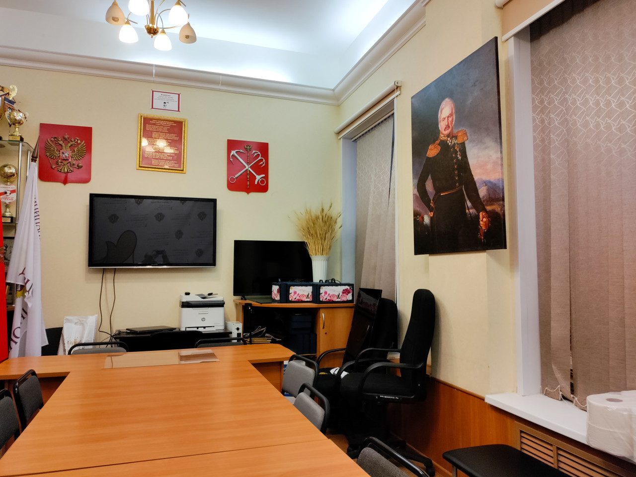 На фото показана часть заседательного зала районной администрации, в котором установлены столы для совещаний, офисные кресла и телевизионная панель. На стене размещены герб Российской Федерации и региональный символ в виде якорей, обозначающий городской район, а также крупный портрет военного деятеля в парадной форме, выполненный в стиле официального исторического парада. Наличие государственной символики указывает на административный статус помещения. Снимок подходит для использования в материалах о работе органов местного самоуправления и устройстве муниципальных учреждений.