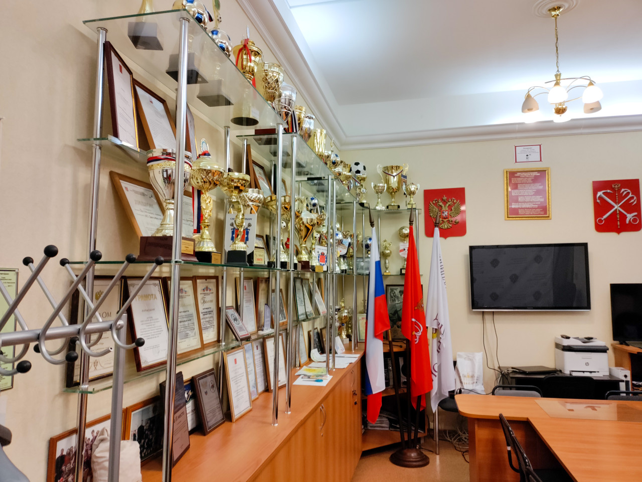 На фотографии показана большая стеклянная витрина с многочисленными спортивными кубками, призами и дипломами, размещённая вдоль стены офисного помещения. Видна символика Российской Федерации и города Санкт-Петербурга, что указывает на принадлежность пространства к государственному или муниципальному учреждению. Герб РФ является официальным государственным символом, восходящим к традиции двуглавого орла, закреплённой в начале XVI века и восстановленной в современной форме в 1993 году. Такой кадр может использоваться для иллюстрации тем о системе поощрений, региональных администрациях, соревнованиях или локальных инициативах.