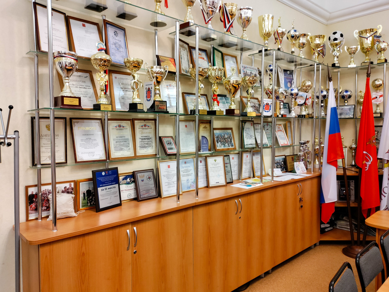 Изображение демонстрирует стеклянную витрину в административном кабинете городского района, заполненную многочисленными кубками, медалями и грамотами, подтверждающими участие и достижения местных коллективов. Справа в кадре стоят государственный флаг России и флаг муниципальной структуры. Витрина размещена на шкафу, где также представлены свидетельства благодарностей и официальные документы. Фото отражает презентационный характер помещения и может использоваться для материалов о локальных спортивных программах и поддержке муниципальных инициатив.