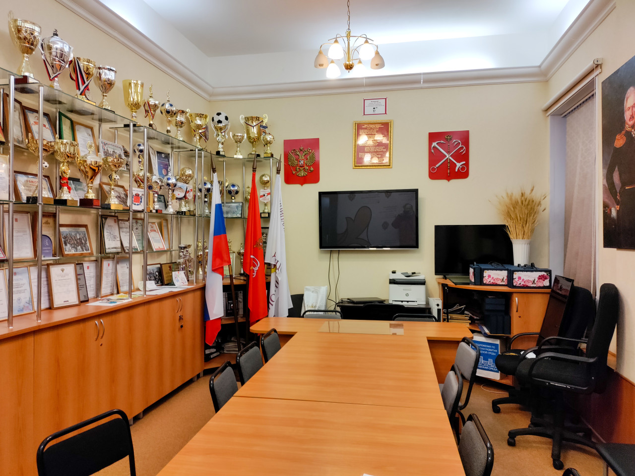 На снимке показано административное помещение с длинным столом для совещаний, телевизионной панелью, гербом Российской Федерации и региональным знаком. По левой стене расположены стеклянные витрины с кубками и дипломами, подтверждающими участие муниципальных команд в конкурсах и соревнованиях. Наличие официальных флагов подчеркивает статус кабинета как части структур городского управления. Изображение может применяться в иллюстрациях к публикациям о местном самоуправлении и административной работе.