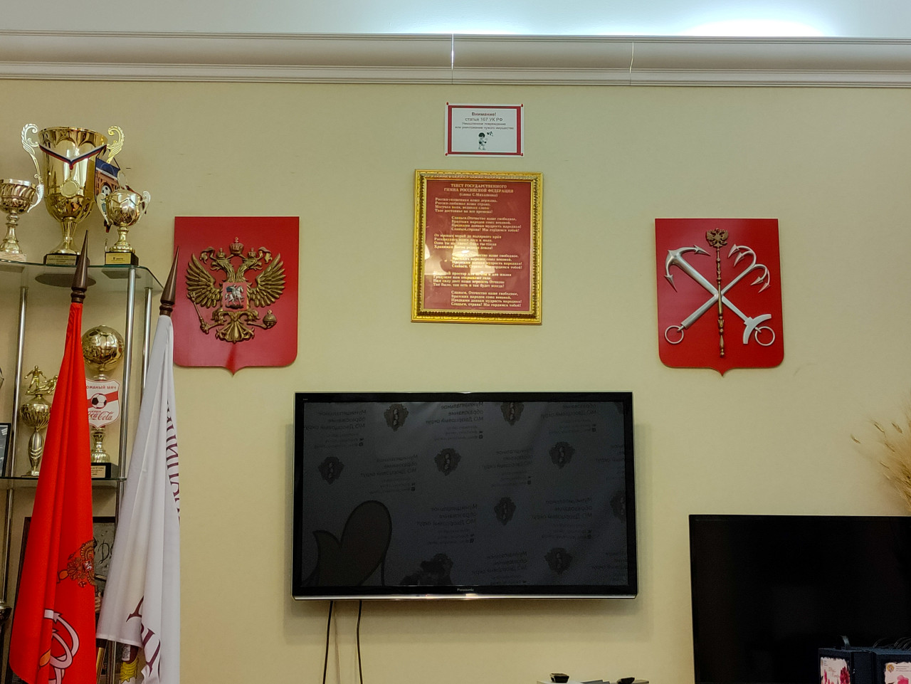 администрация муниципалитет органы власти государственная символика официальный интерьер конференц зал кабинет герб Российская Федерация Санкт Петербург экран стена символика официальное помещение интерьер заседание орган власти протокол флагштоки публичные мероприятия государственный символ региональная власть учреждение оформление стены презентационная зона деловая среда экранная панель совещание офис эмблемаПохожие фотографии