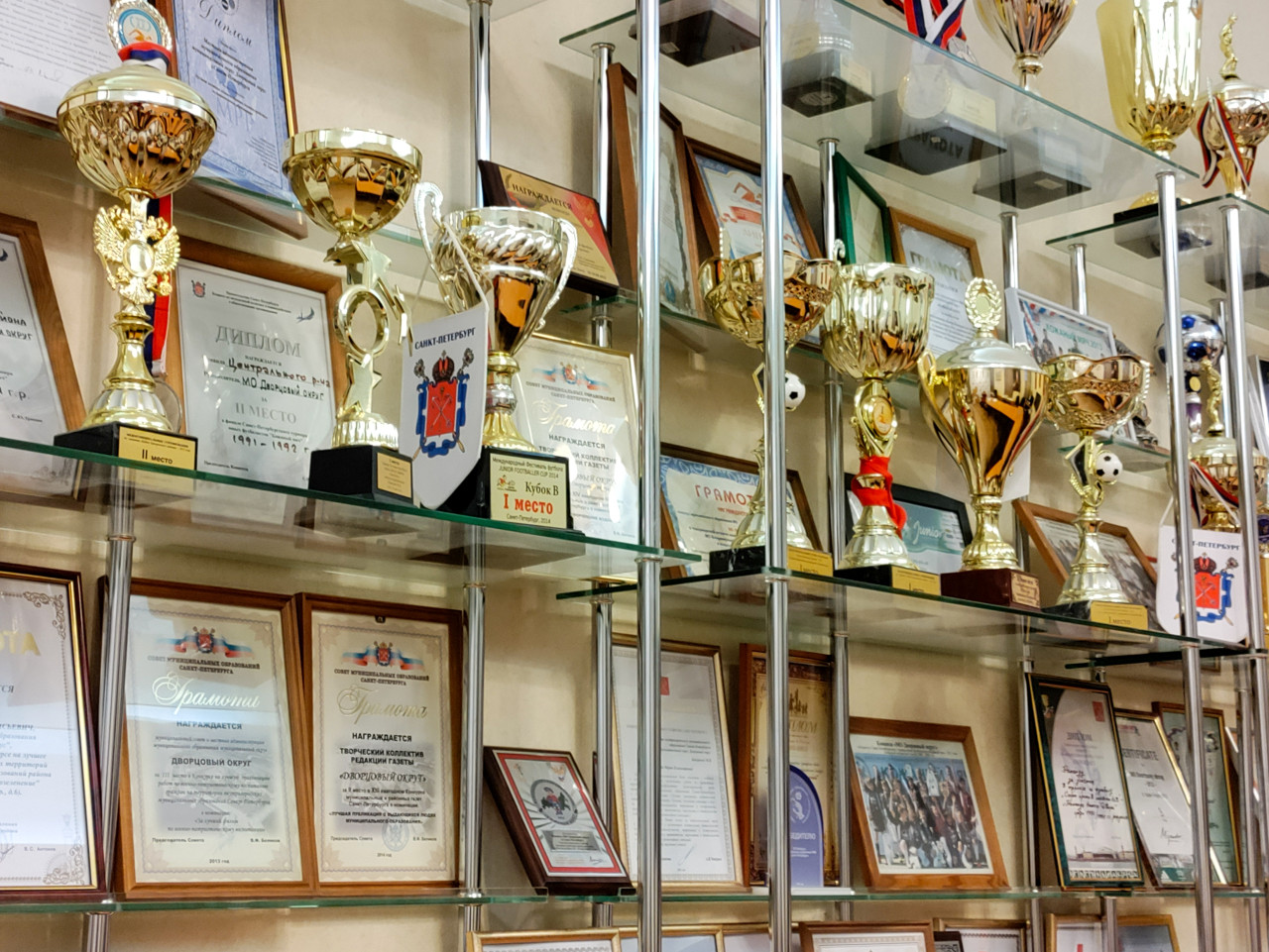 В кадре показана насыщенная наградная экспозиция: многочисленные кубки, дипломы и фотографии размещены на многоуровневых стеклянных стеллажах. Рядом заметна часть флага, подтверждающая официальную принадлежность коллекции учреждению. Экспозиция отражает участие организации в спортивных и общественных мероприятиях разных лет. Окружение позволяет предположить административное или культурное учреждение, использующее помещение для отчётных заседаний. Фотография может быть полезна для иллюстраций о конкурсах или работе федераций.