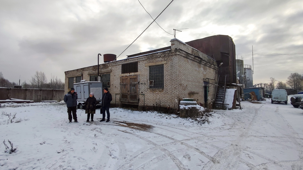 На фотографии показана территория перед действующим центральным тепловым пунктом, расположенным на обслуживаемой площадке коммунальной инфраструктуры. Здание выполнено из светлого силикатного кирпича и имеет характерные для технических сооружений стеклоблочные оконные проёмы. Фасад оборудован воротами и инженерными вводами, рядом установлено мобильное оборудование на раме-прицепе. Перед ЦТП видна открытая снеговая площадка с дорожными следами и участками инженерных коммуникаций возле стены. В кадре также зафиксирована прилегающая техническая зона с подъездным путём и хозяйственными постройками. Фотографию можно использовать в материалах о теплоснабжении жилого фонда, инфраструктуре ЖКХ и инженерном обслуживании муниципальных объектов.