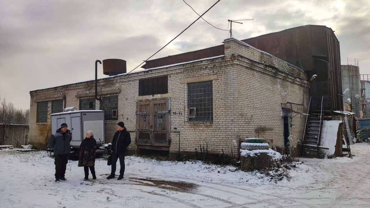 На фотографии показан действующий центральный тепловой пункт, обслуживающий жилой фонд. Здание из белого силикатного кирпича с плоской кровлей, в оконных проёмах установлены стеклоблоки. Центральную часть фасада занимают деревянные двустворчатые ворота с табличкой и знаком электробезопасности; по правой стороне видны металлическая наружная лестница и габаритные металлоконструкции. Слева у стены размещён передвижной генераторный модуль на прицепе. По фасаду проходят кабели и вентиляционные решётки. Перед зданием стоят три человека в зимней одежде, фиксируя осмотр объекта. Территория покрыта свежим снегом, на площадке заметны следы транспорта и инженерная арматура. Снимок подходит для материалов о теплоснабжении многоквартирных домов, работе коммунальных служб, эксплуатации ЦТП и организации инженерной инфраструктуры в холодный период года.