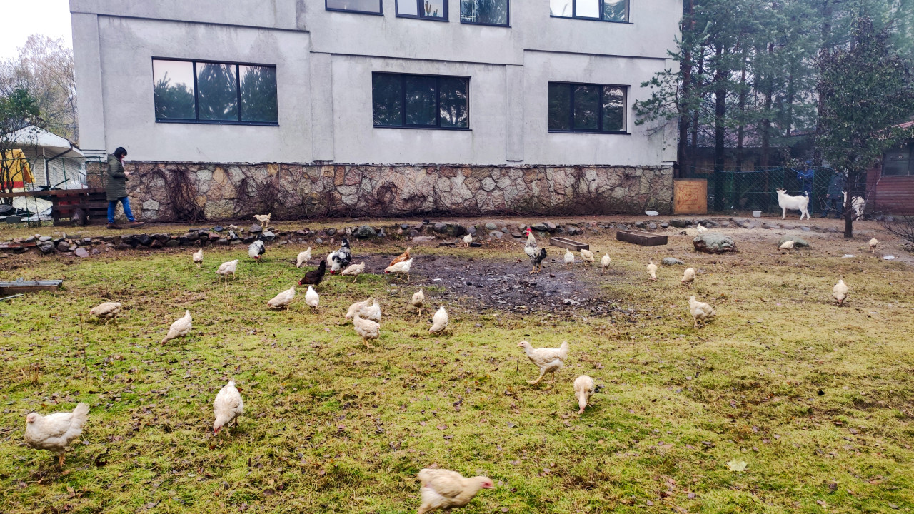 На фотографии изображён участок перед фасадом двухэтажного дома с каменным цоколем и большими окнами. На переднем плане по газону гуляют куры, а справа видны козы в огороженном пространстве. На заднем плане женщина проводит визуальный осмотр здания. Сцена снята в пасмурную погоду, вероятно, в ходе обследования территории частного домовладения. Фото может быть использовано для тем, связанных с сельским хозяйством, архитектурой, фермерством и обследованием построек.
