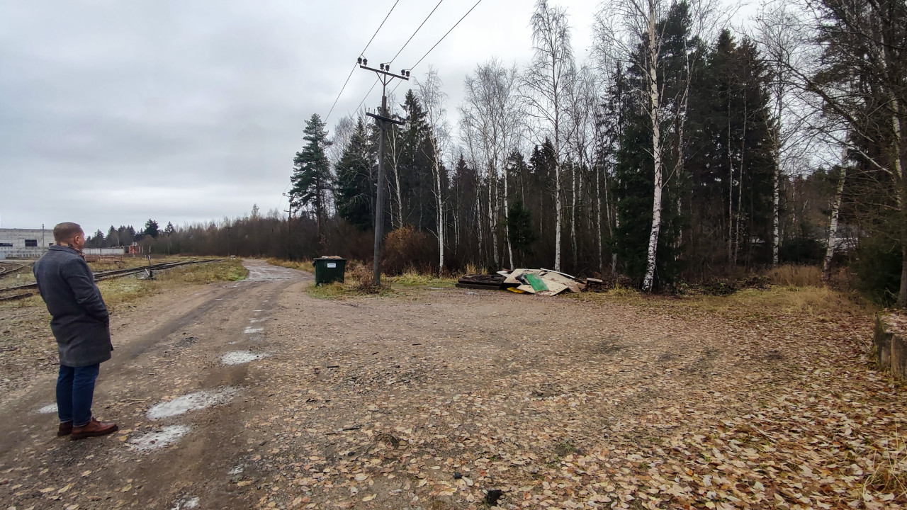На фотографии изображён мужчина, стоящий на грунтовой дороге у железнодорожных путей в промышленной зоне. Вдоль дороги установлены деревянные опоры линии электропередачи, рядом — мусор и строительные отходы. На заднем плане — лесополоса с берёзами и хвойными деревьями. Пасмурная осенняя погода. Изображение можно использовать для тем, связанных с инженерными обследованиями территорий, промышленными объектами и благоустройством.