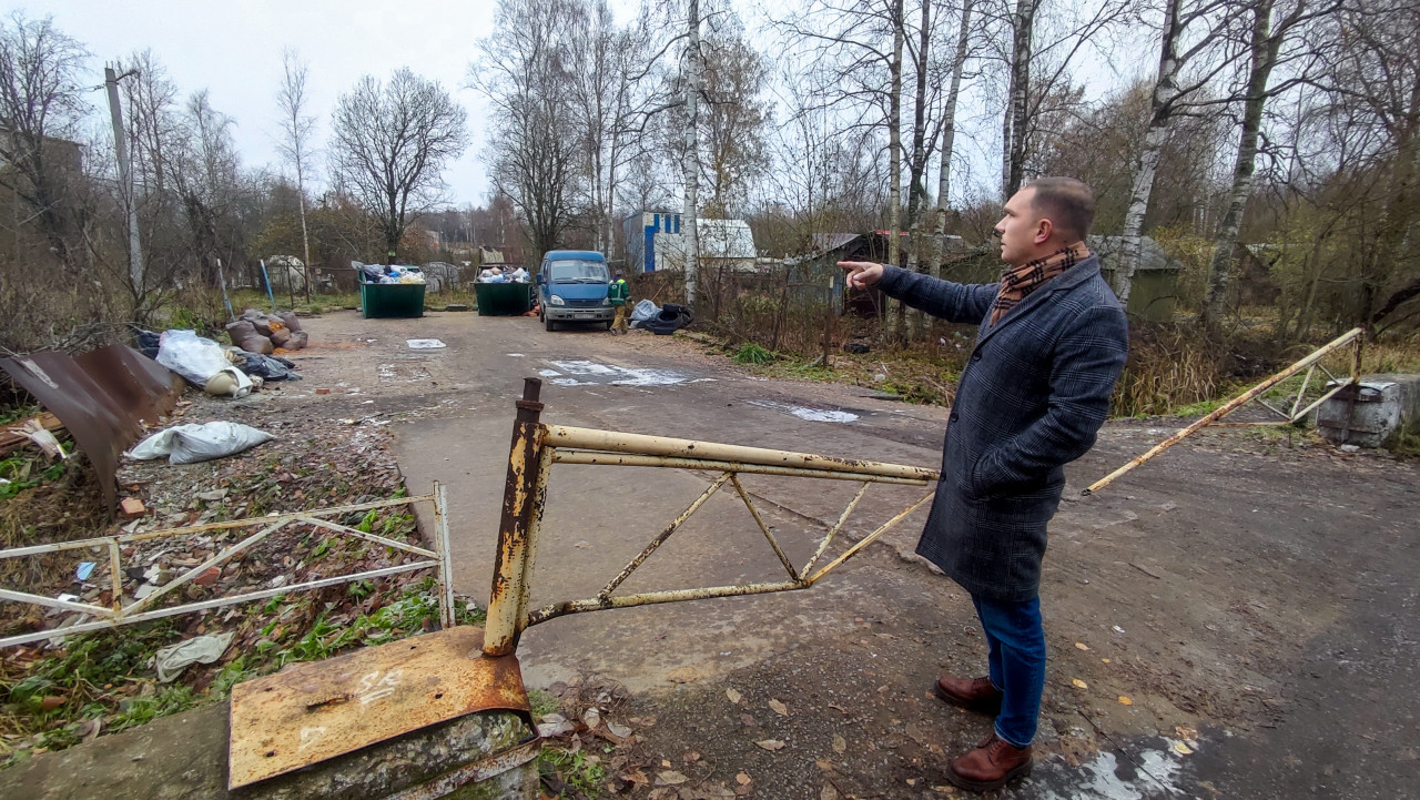 На снимке изображён мужчина в пальто, указывающий рукой в сторону мусорной площадки, где стоят зелёные контейнеры, мешки с отходами и автомобиль. На заднем плане — деревья без листвы и постройки. Погода пасмурная, конец осени. Сцена может быть использована в материалах, посвящённых инспекциям, контролю состояния коммунальных территорий и вопросам благоустройства.