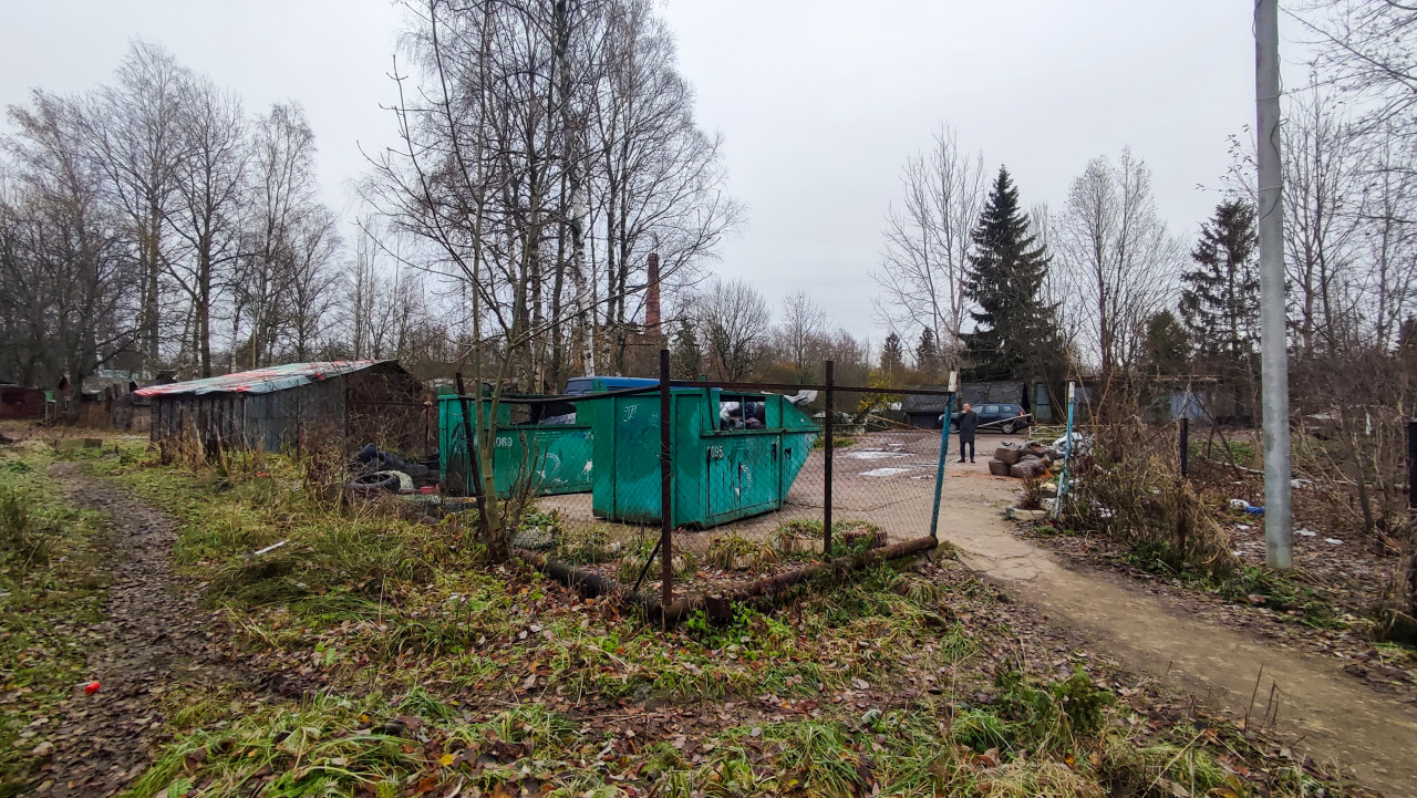 На фотографии изображена ограждённая территория с несколькими зелёными мусорными контейнерами. Площадка находится на окраине жилой зоны, вокруг растут деревья и кустарники, видны старые хозяйственные постройки. Пасмурная осенняя погода. Фото может использоваться в статьях и отчётах о санитарном состоянии дворовых территорий, инженерном контроле и экологическом мониторинге.