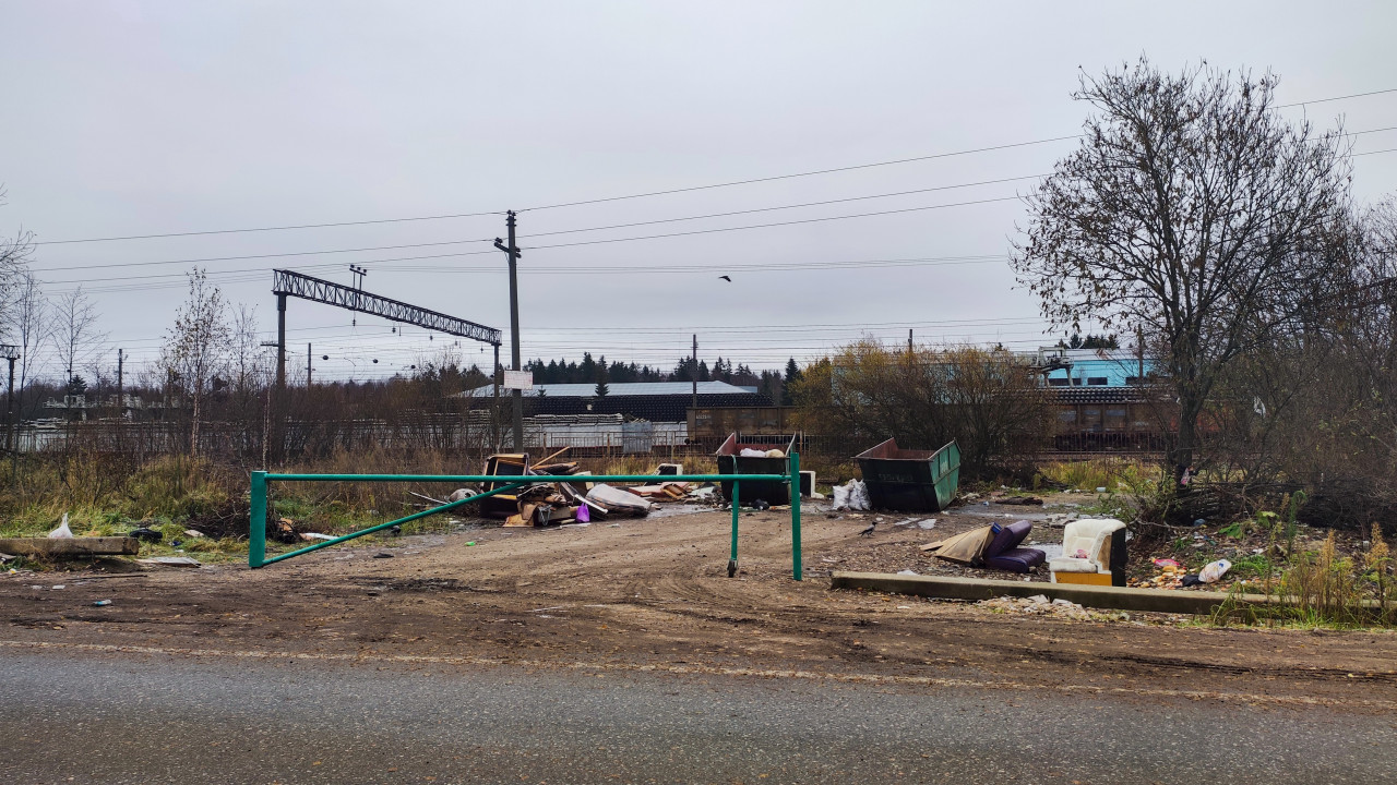 На фотографии изображён участок земли вдоль дороги, где установлены мусорные контейнеры и разбросаны отходы — мебель, доски, пластик и мешки с мусором. На фоне видны опоры контактной сети и элементы железнодорожной инфраструктуры. Пасмурная погода, поздняя осень. Фото можно использовать для публикаций о проблемах экологии, благоустройства и санитарного состояния промышленных территорий.