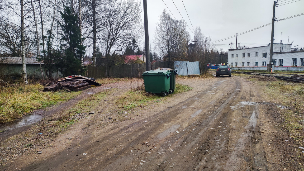 На фотографии показан участок грунтовой дороги, проходящей вдоль железнодорожных путей в промышленной зоне. На переднем плане — мусорные контейнеры и куча старых шпал. Вдали виден двухэтажный административный корпус и металлические опоры ЛЭП. Пасмурная осенняя погода. Фото может использоваться в публикациях о состоянии инфраструктуры, благоустройстве промышленных территорий и инженерных обследованиях.