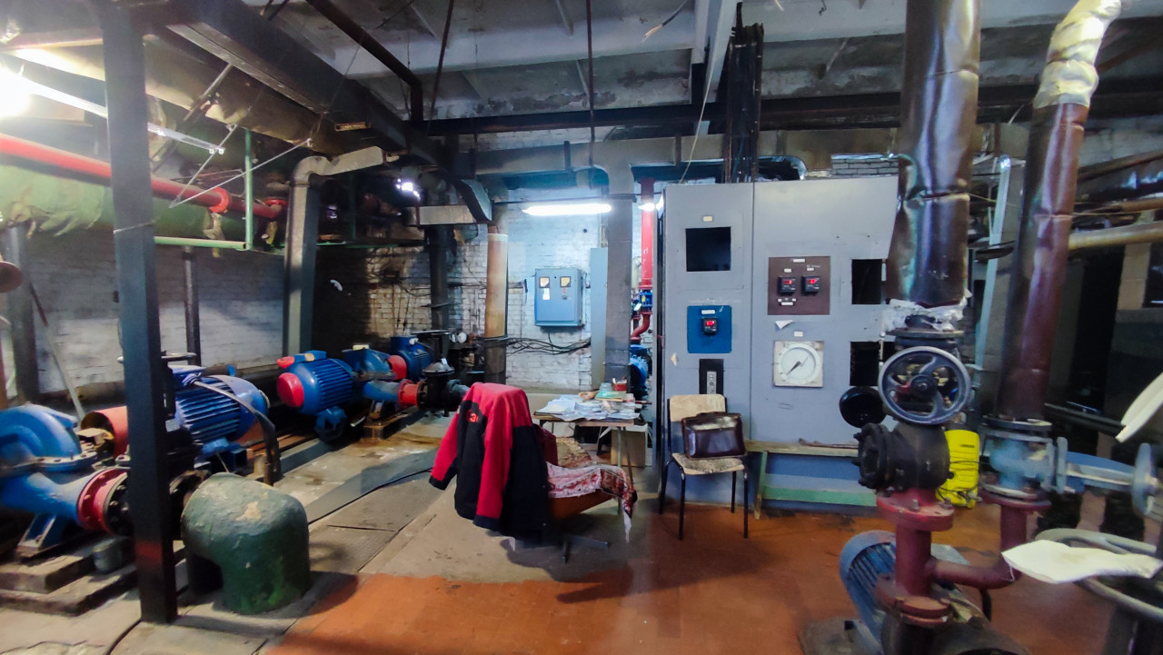 Инженерное помещение с насосами, трубами и распределительными щитами