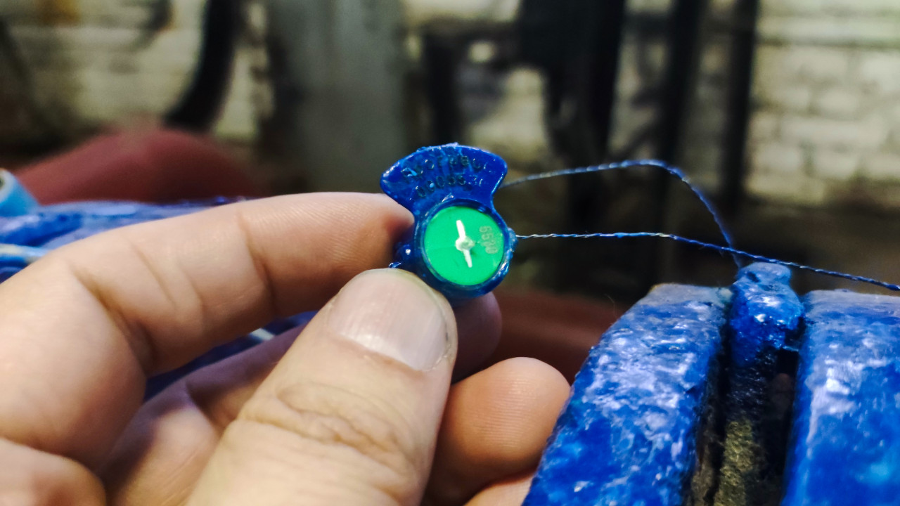 На изображении показана пломбировка фланцевого соединения трубопровода, выполненная с применением пластиковой пломбы с фиксирующим элементом. Пломба установлена на месте стыкования трубопровода, что свидетельствует о контроле целостности узла и исключает несанкционированное вмешательство в линию. В кадре крупным планом видна рука, удерживающая пломбу для демонстрации ее состояния. На фоне различим участок трубы, окрашенной в синий цвет, характерный для холодного водоснабжения. Подобные элементы используются на коммерческих или распределительных узлах учета для фиксации факта поверки или ввода оборудования в эксплуатацию. Снимок может применяться в технической документации по пломбировке, отчетах о поверке или инженерных обследованиях.