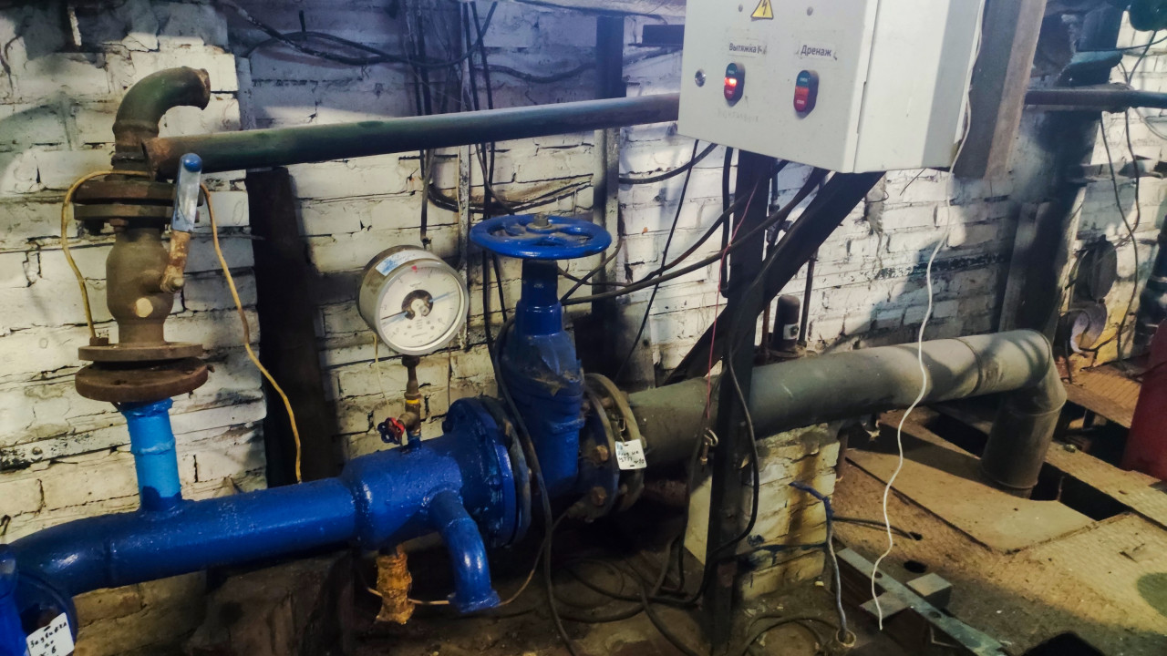 На фотографии показан участок трубопровода с установленным запорным вентилем, манометром и электрическим щитом управления. Трубы окрашены в синий и серый цвета, часть системы поддерживается металлическими и кирпичными конструкциями. На стене заметна старая кирпичная кладка и кабельная разводка. Сцена демонстрирует элементы действующей системы отопления или водоснабжения промышленного здания. Материал подходит для публикаций об инженерных системах, эксплуатации и контроле технических узлов.