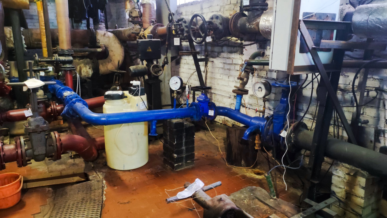 На снимке изображён участок теплового узла с системой трубопроводов, окрашенных в синий и красный цвета. В кадре видны запорные вентили, манометры, пластиковая ёмкость и электрический щит управления с сигнальными лампами. Помещение выполнено из кирпича, на стенах проложены кабели и элементы автоматики. Обстановка отражает эксплуатационное состояние действующего инженерного объекта. Фотография может использоваться для иллюстрации работы тепловых сетей, инженерных коммуникаций и систем теплоснабжения.