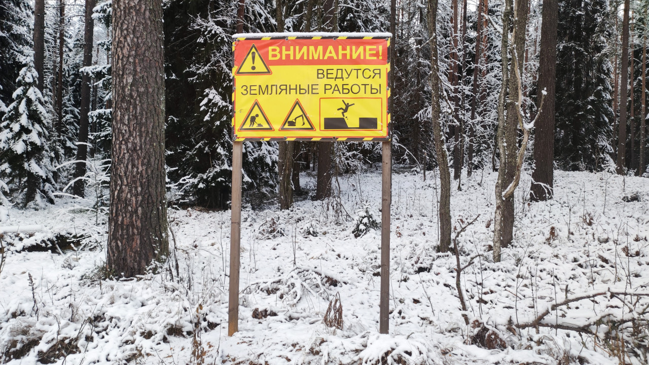 Предупреждающий щит о проведении земляных работ в зимнем лесу